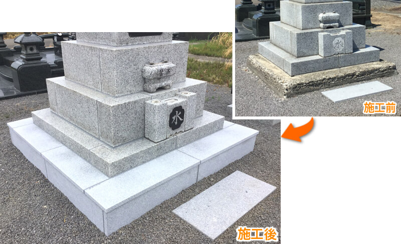 工事の工程としては、まずは左官の表面の傷んだ部分をはつって取り除き、中のコンクリートは確認して、活かせる部分は活かします。その後、表面をきれいに整えてから石貼りをし、目地を入れて完成です。こちらのお墓は、お墓本体のクリーニング、目地入れなども一緒に行いました。